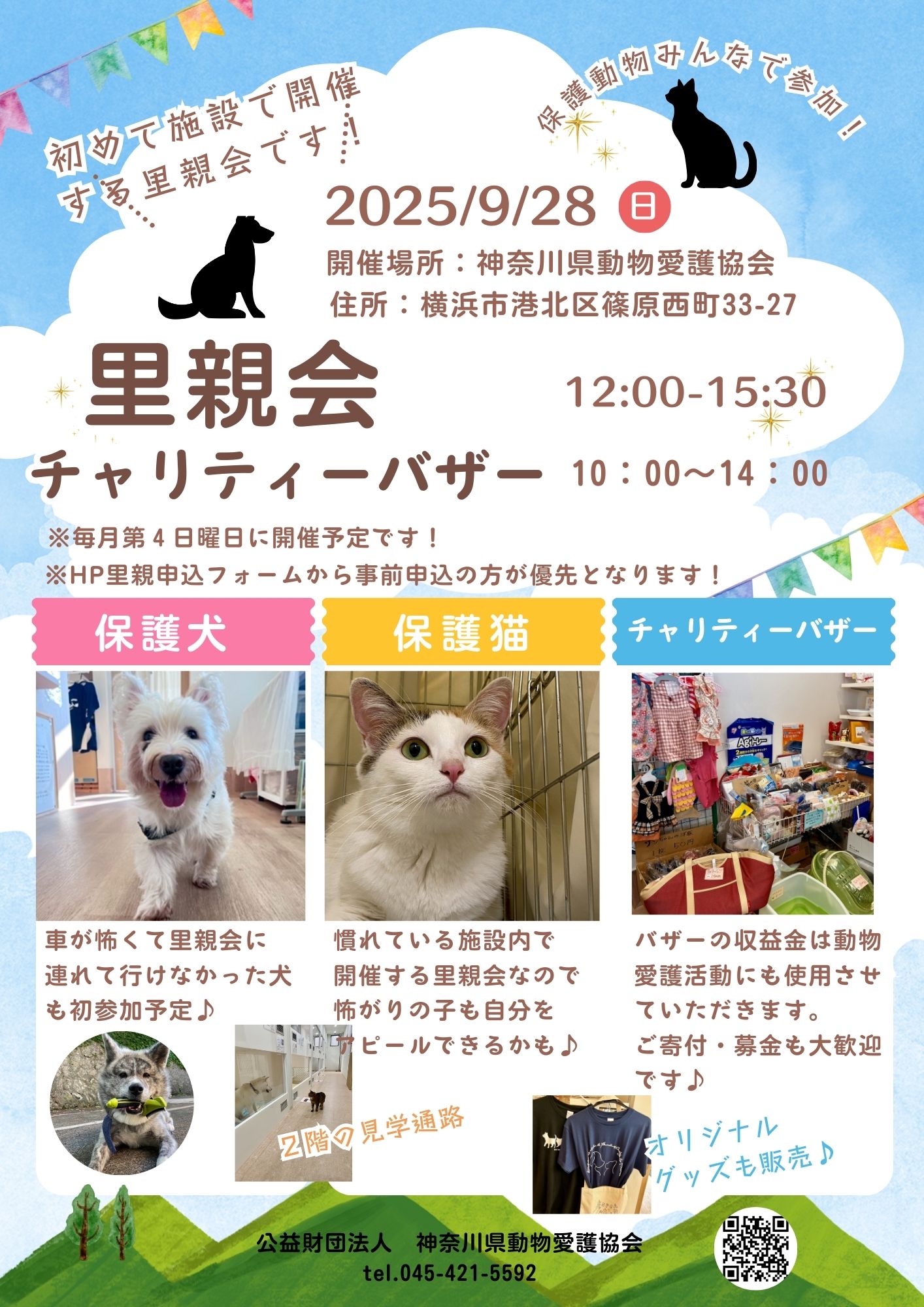 施設で初めて里親会を開催します。毎月第4日曜日に施設内でチャリティーバザーを開催しておりますが、2025年9月28日より「里親会&チャリティーバザー」を開催することになりました。これまで、車が怖くて連れていけなかった犬や、慣れない会場が怖くてアピールができなかった猫など、多くの保護動物が参加予定です。